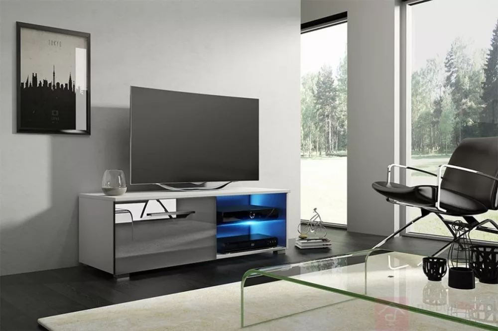 MOON fényes szürke és fehér tv szekrény, polccal és ajtós tárolóval, mely a bútor praktikus kialakításának köszönhetően bármelyik nappaliban/hálószobában megállja a helyét.