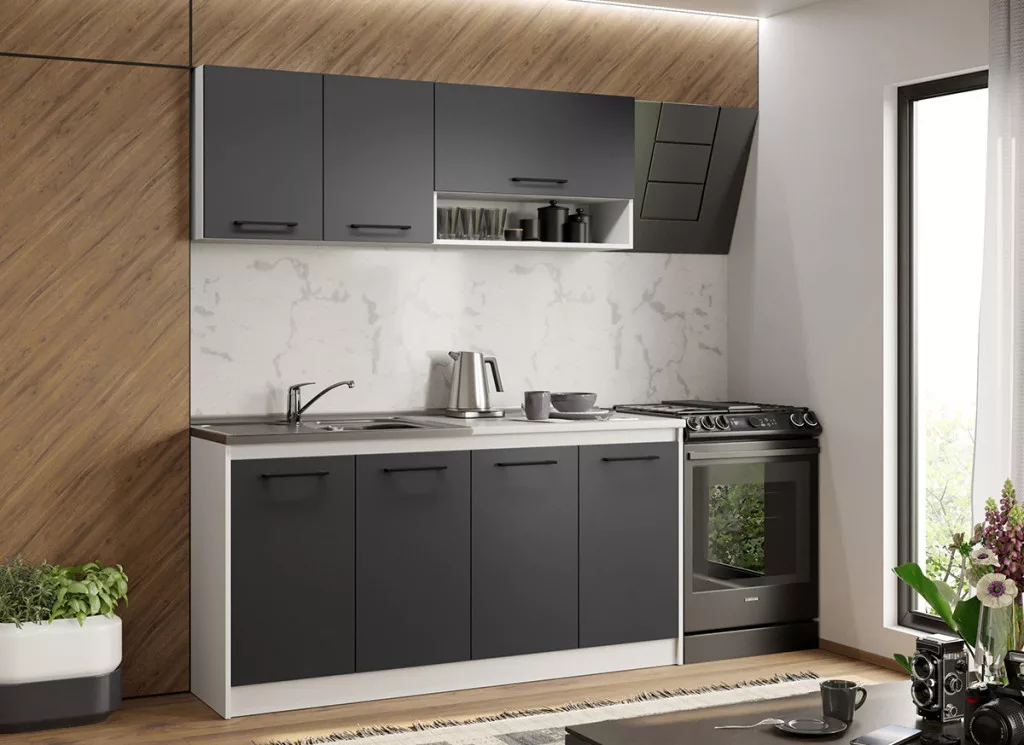 A Maia kollekció modelljeinek, alsó és felső elemei tágas tárolóhelyekkel rendelkezik a konyhai edények számára. Az elemek 16 mm-es préselt bútorlapból készülnek. Az antracitszürke felület eleganciát és kifinomultságot közvetít.