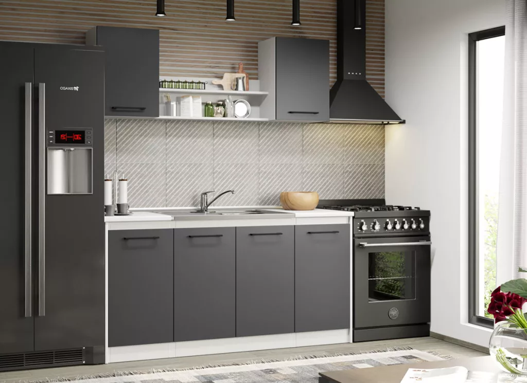 A Maia kollekció modelljeinek, alsó és felső elemei tágas tárolóhelyekkel rendelkezik a konyhai edények számára. Az elemek 16 mm-es préselt bútorlapból készülnek. Az antracitszürke felület eleganciát és kifinomultságot közvetít.