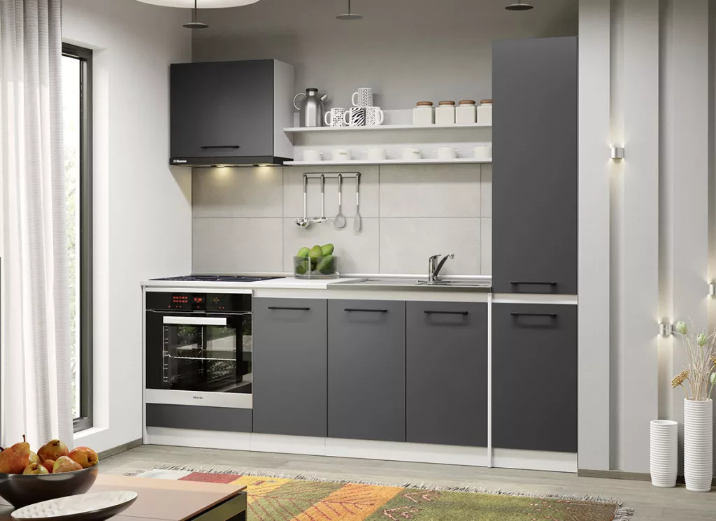 A Maia kollekció modelljeinek, alsó és felső elemei tágas tárolóhelyekkel rendelkezik a konyhai edények számára. Az elemek 16 mm-es préselt bútorlapból készülnek. Az antracitszürke felület eleganciát és kifinomultságot közvetít.