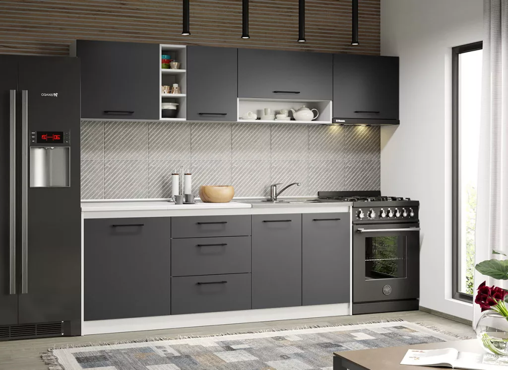A Maia kollekció modelljeinek, alsó és felső elemei tágas tárolóhelyekkel rendelkezik a konyhai edények számára. Az elemek 16 mm-es préselt bútorlapból készülnek. Az antracitszürke felület eleganciát és kifinomultságot közvetít.