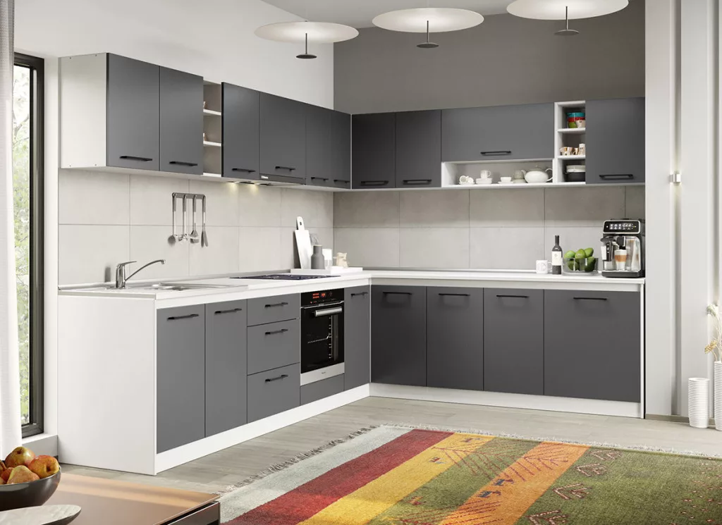 A Maia kollekció modelljeinek, alsó és felső elemei tágas tárolóhelyekkel rendelkezik a konyhai edények számára. Az elemek 16 mm-es préselt bútorlapból készülnek. Az antracitszürke felület eleganciát és kifinomultságot közvetít.