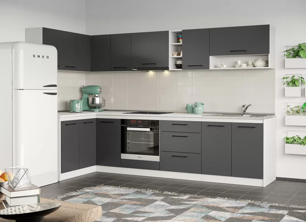 A Maia kollekció modelljeinek, alsó és felső elemei tágas tárolóhelyekkel rendelkezik a konyhai edények számára. Az elemek 16 mm-es préselt bútorlapból készülnek. Az antracitszürke felület eleganciát és kifinomultságot közvetít.