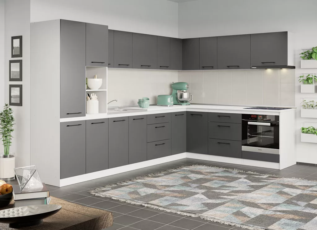 A Maia kollekció modelljeinek, alsó és felső elemei tágas tárolóhelyekkel rendelkezik a konyhai edények számára. Az elemek 16 mm-es préselt bútorlapból készülnek. Az antracitszürke felület eleganciát és kifinomultságot közvetít.