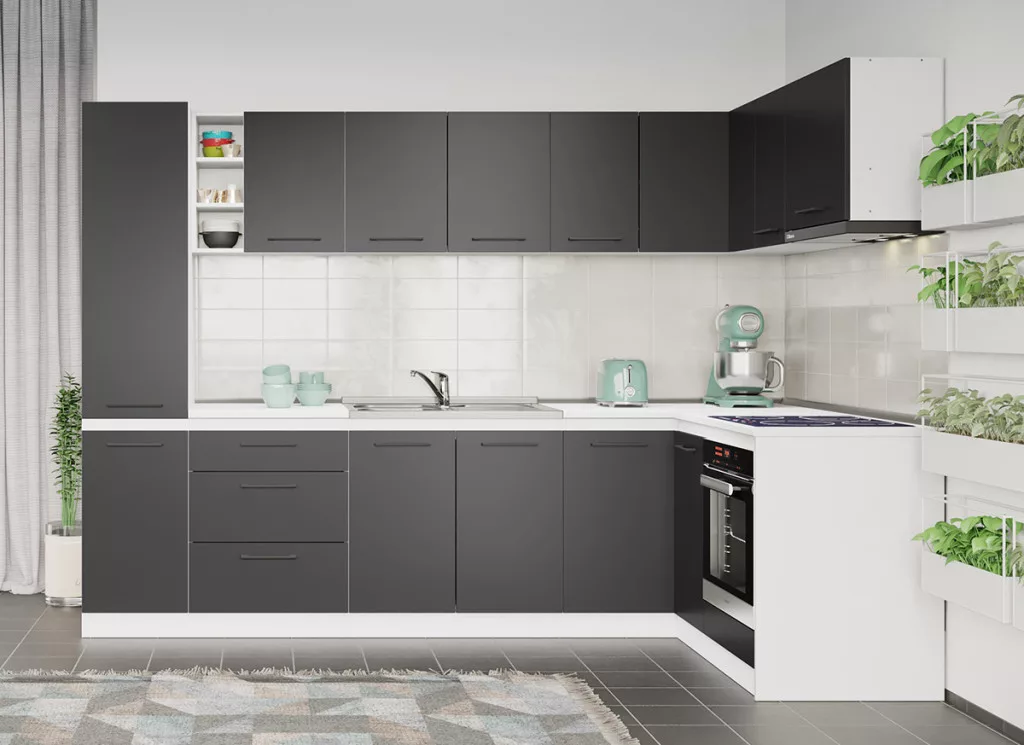 A Maia kollekció modelljeinek, alsó és felső elemei tágas tárolóhelyekkel rendelkezik a konyhai edények számára. Az elemek 16 mm-es préselt bútorlapból készülnek. Az antracitszürke felület eleganciát és kifinomultságot közvetít.