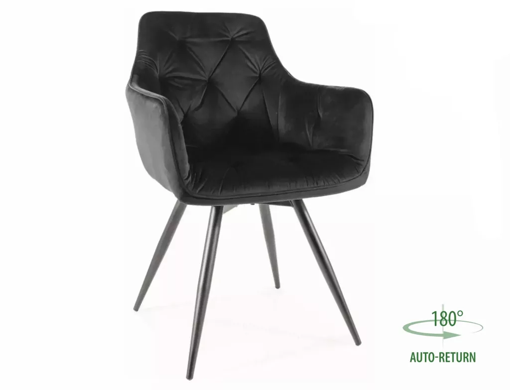 Szék, Bluvel bársony szövet, szín: fekete 19, váz: fém, matt fekete. Az ülés 180 fokban elforgatható, visszaforgató funkcióval.