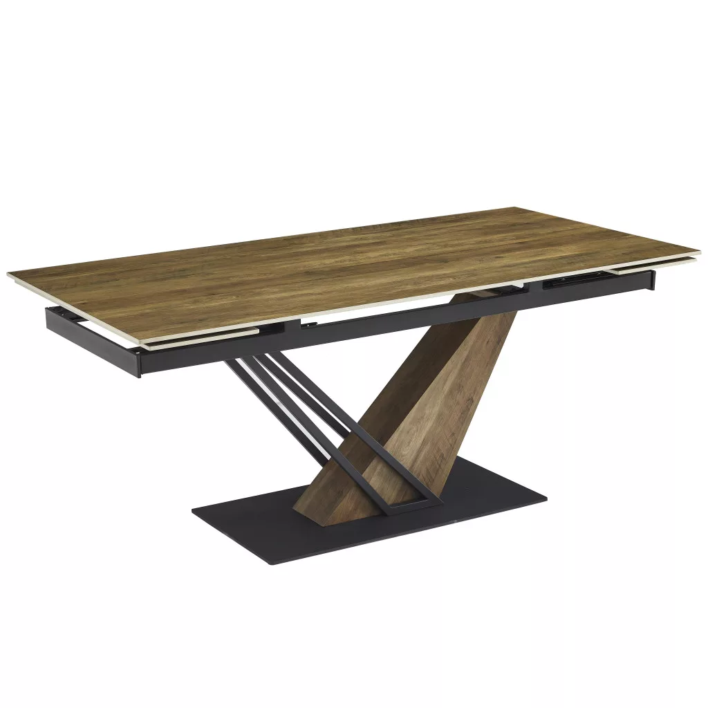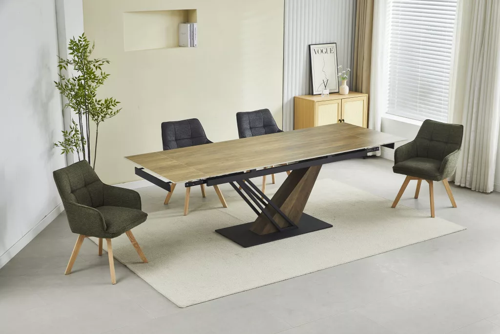 Meghosszabbítható étkezőasztal kerámia asztallappal, tölgyfa utánzattal, így sokoldalú kiegészítője lehet bármilyen étkezőnek, miközben természetes esztétikát biztosít.