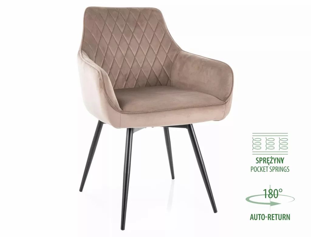 Fedezd fel a Krzesło Marlo Velvet széket, amely tökéletes választás modern otthonokba! A sötét bézs és fekete matt színkombináció eleganciája kölcsönöz nappalidnak vagy konyhával. A bársony kárpitozás és kényelmes ülés, amely 180 fokban forgatható, biztosítja a maximális kényelmet és stílust. kész a praktikus auto-return funció lehetővé teszi, hogy a szék mindig visszakerüljön eredeti helyzetébe.