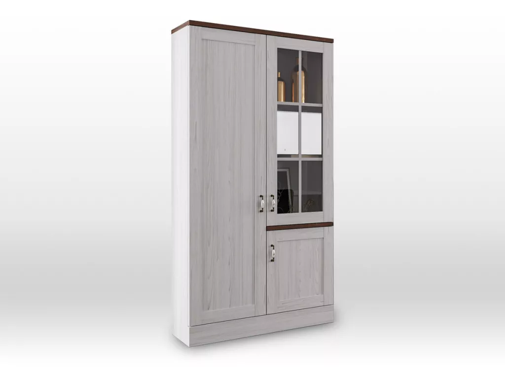 2 ajtós vitrin - Melos Nappali Furniture - Elegáns stílusban készült, amely ötvözi a klasszikust a modernnel. A vitrin 2 tárolórekeszre van osztva, amelyeket egy ajtó fed + 3 polcos polcra, amelyeket egy üvegajtó fed, díszítőelemekkel díszítve.