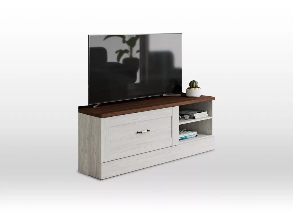 • A TV-szekrény két polcos tárolóhellyel és egy zárt térrel rendelkezik.