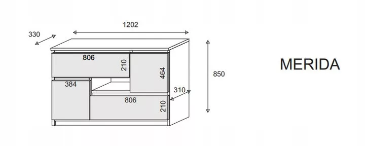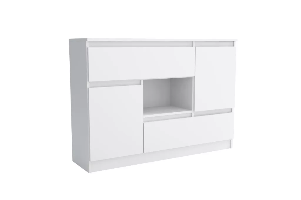 A MERIDA komód egy modern bútordarab két polcos oldalszekrénnyel és egy nyitott polccal és két fiókkal ellátott középső résszel - ideális tárolásra és bemutatásra. A komód két színváltozatban kapható.