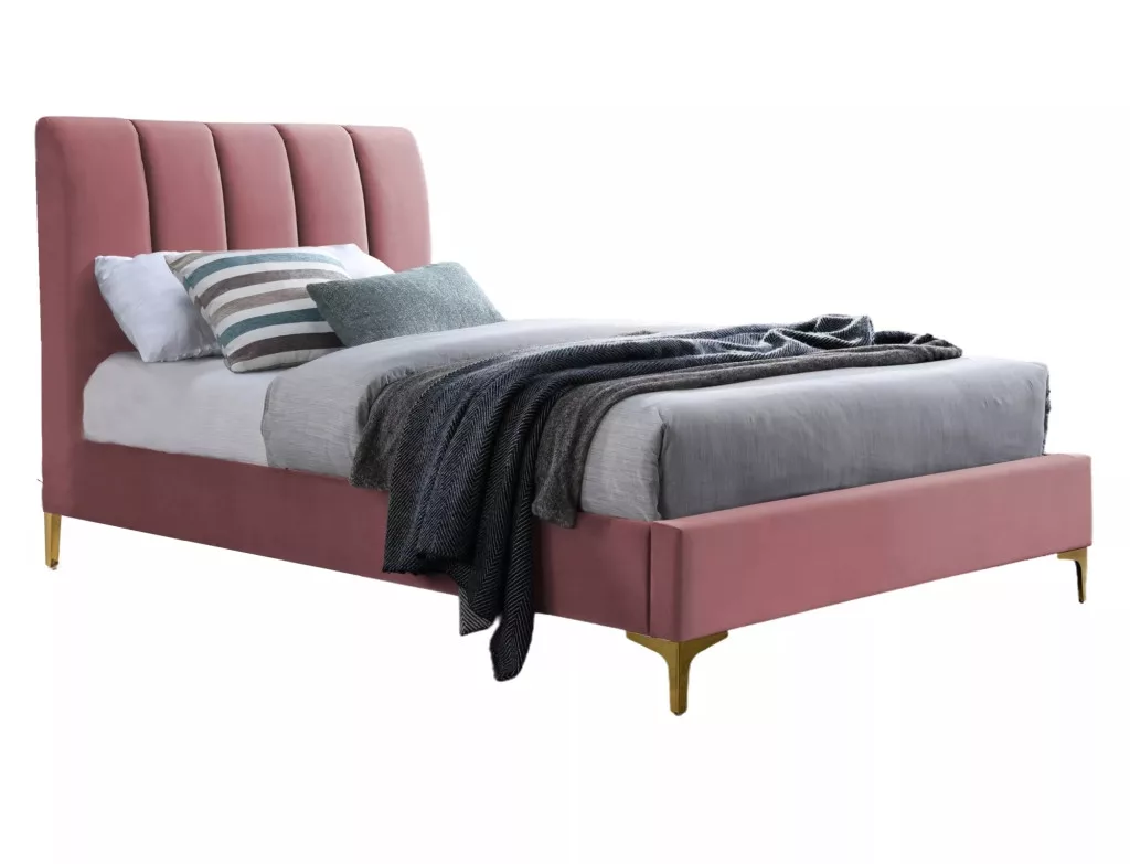Ágy, bársonyhuzat: antik rózsaszín, kárpitozás 185 / fém, szín: arany. Az ágy váza hajlított lécekkel, rugalmas fogantyúkba ágyazva. Matrac mérete 90x200cm (ár matrac nélkül).