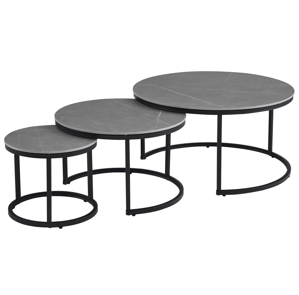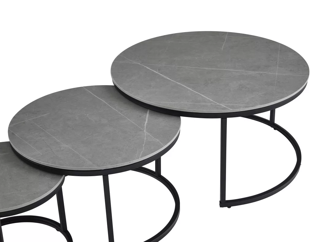 Három kerek dohányzóasztalból álló szett, amelyek egymás alá helyezhetők. A panelek szinterezett kőből készültek, gyönyörű márvány mintával matt Armani szürke színben. Minden asztallap vastagsága 1,2 cm. Összetevő anyaguk, a szinterezett kő, több különböző színű természetes kő kombinációjából készül, és számos előnnyel rendelkezik a hagyományos kerámiákkal szemben. Erősebb, mint a nagy kerámialapok, és nem törik könnyen, valamint természetesen vízálló a természetes gránitlapokhoz képest. Környezetbarátabb is, mint a kémiailag kezelt kvarclapok. A legnagyobb asztal átmérője 80 cm, a középső asztalé 60 cm, a legkisebb asztalé pedig 40 cm. Az asztalok alapja porszórt fémcsövekből készült, 1,2 mm vastagságú és 2x2 cm külső méretekkel. Az asztalok úgy illeszkednek, hogy egy kisebb asztal a nagyobb alá helyezhető, így kevesebb helyet foglal. Külön-külön is használhatja őket, vagy egymásra is rakhatja őket az igényei szerint. Minden dohányzóasztal maximális teherbírása 120 kg. Tekintse meg a szett szürke és fehér márvány színű változatát, valamint egy hasonló, két részből álló dohányzóasztal-garnitúrát is!