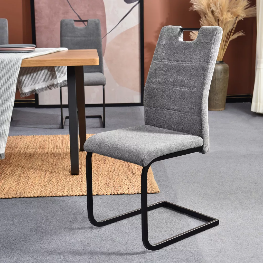 Elegáns étkezőszék, amely stilizált dizájnjával feldobja otthonát. A szék minőségi, szürke színű szövettel van kárpitozva. Az ülőfelület 4 cm vastag a kényelmes ülés érdekében. Az alap 15x25 mm méretű fémcsövekből készült, és fekete színű porfestett. A szék talpára kis, lekerekített lábvédők vannak felszerelve. A szék maximális teherbírása 120 kg.