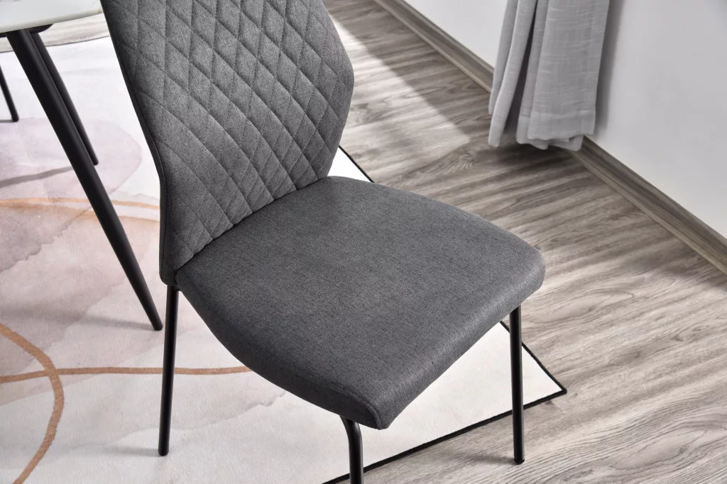Egyszerű étkezőszék ergonomikus formájú háttámlával. Az ülőfelület és a háttámla minőségi szövettel kárpitozottak, több színben kapható. A 6 cm vastag ülőfelület kényelmes ülést biztosít. A szék alapja 1,9 cm átmérőjű, kerek fémcsövekből készült, és fekete színű porfestékkel van bevonva a jobb védelem érdekében. A szék maximális teherbírása 120 kg.