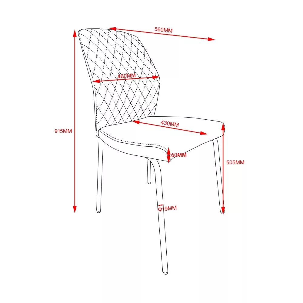 Egyszerű étkezőszék ergonomikus formájú háttámlával. Az ülőfelület és a háttámla minőségi szövettel kárpitozottak, több színben kapható. A 6 cm vastag ülőfelület kényelmes ülést biztosít. A szék alapja 1,9 cm átmérőjű, kerek fémcsövekből készült, és fekete színű porfestékkel van bevonva a jobb védelem érdekében. A szék maximális teherbírása 120 kg.