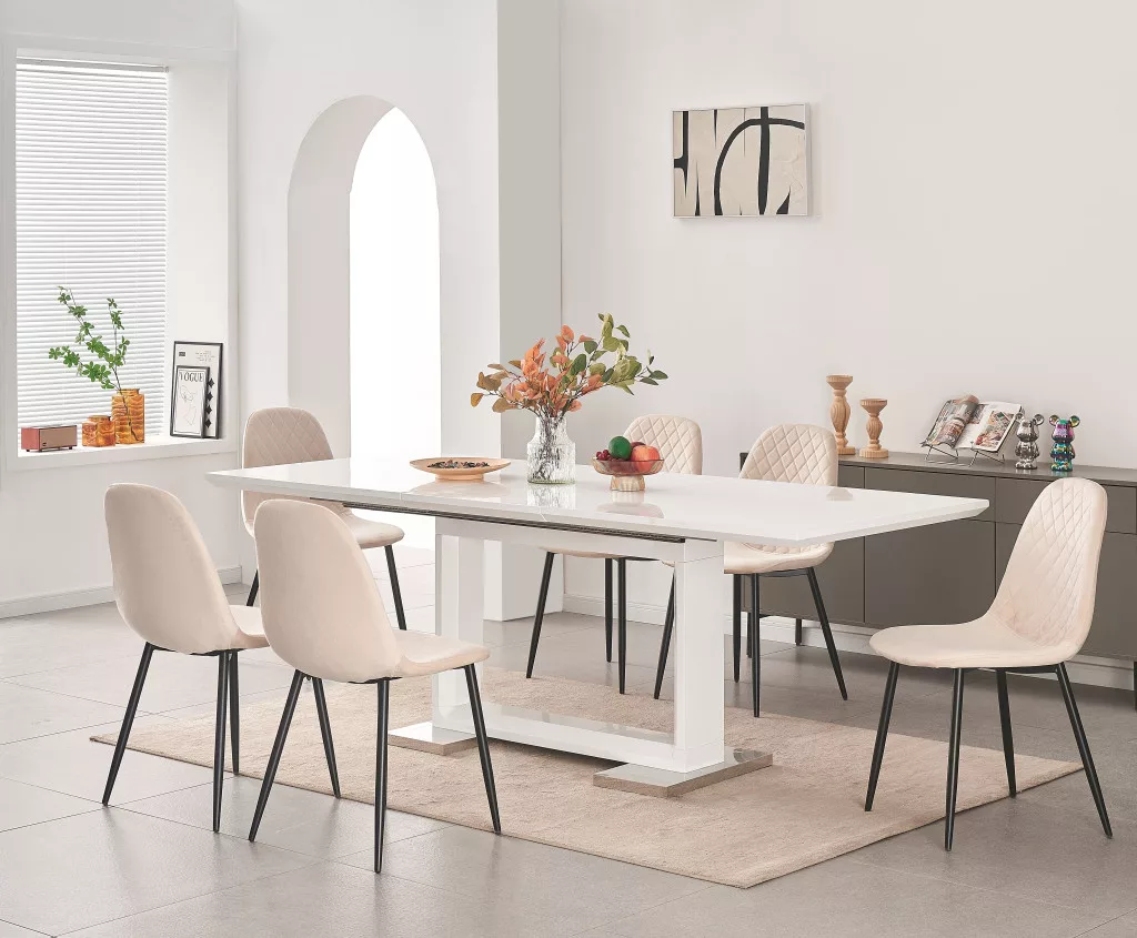 Kihúzható asztal magasfényű fehér színben, többféle méretben kapható. Az asztallap közepén egy betét található, amellyel az asztal nagyobb méretűre nyújtható, és könnyen kihúzható. Minden asztalméret 76 cm magas. A téglalap alakú asztallap és a váz MDF anyagból, a padlólapok pedig rozsdamentes acélból készültek. Összecsukott állapotban az összes asztal maximális teherbírása 130 kg, de kihúzott állapotban a maximális teherbírás változatonként eltérő. Egy 120/170 cm-es asztal kihúzott állapotban akár 120 kg-ot, egy 140/190 cm-es asztal akár 100 kg-ot, egy 160/210 cm-es asztal pedig akár 80 kg-ot is elbír.