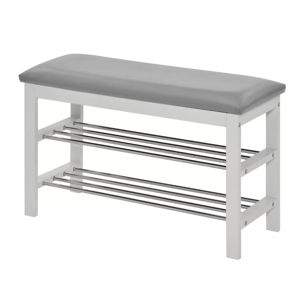 Praktikus előszobai pad két cipőtartóval, teljesen fekete színben vagy fehér és szürke színkombinációban, krómozott rudakkal. Kompakt kialakításának köszönhetően tökéletesen illeszkedik kis szobákba és szűk folyosókra. A pad teteje PVC anyaggal kárpitozott és habbal töltött a kényelmesebb ülés érdekében. A pad váza és lábai fenyőfából, a cipőtartó rudak pedig fémcsövekből készültek. A párnázott felső lap maximális teherbírása 90 kg.