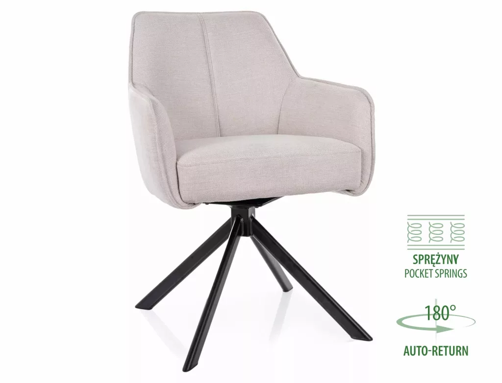 Szék, kárpitozás: Brego 22 szövet, váz: fém, szín: világos bézs / fekete fém. Automatikus visszatérítési funkció - az ülés 180 fokban elforgatható, és visszatér az eredeti helyzetébe. Zsebrugók az ülőfelületben.