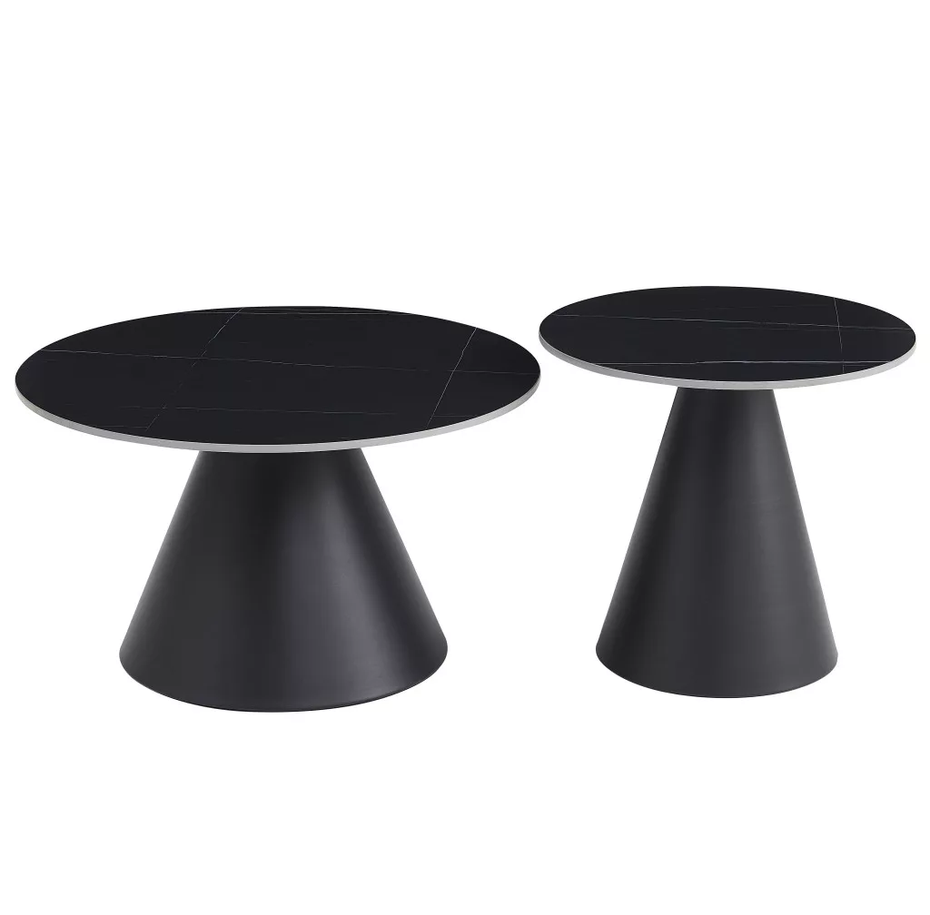 Két kerek dohányzóasztalból álló szett, mindkettő matt fekete színű, márvány mintázatú asztallappal, széles kúpos talpon áll. Az asztallapok 1,1 cm vastagok és szinterezett kőből készültek.