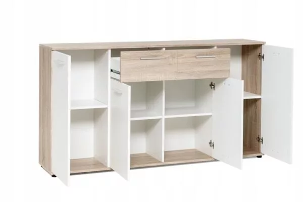 A 160 cm széles bútor bőséges tárolóhellyel rendelkezik, a két fióknak és a 4 ajtós résznek köszönhetően.
