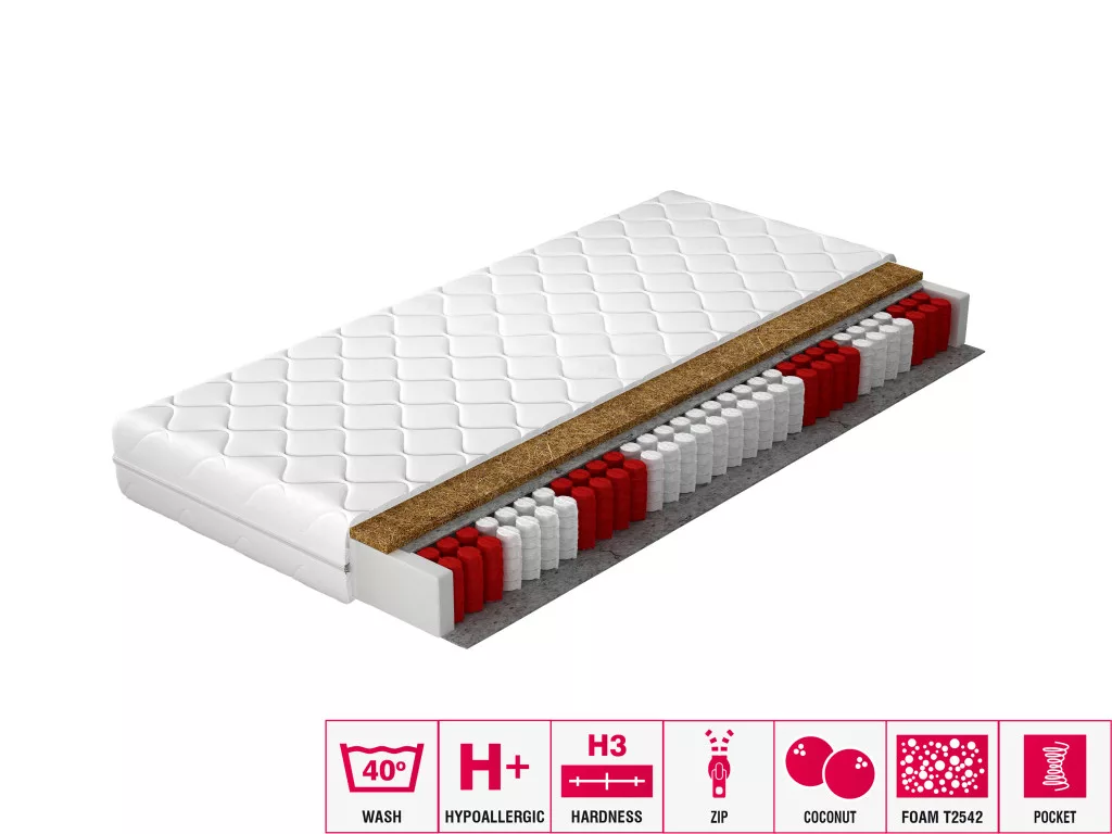 Életünk 1/3-át ágyban töltjük, ezért tisztában vagyunk a kényelmes alvás fontosságával. A tökéletes pihenés a megfelelő matrac kiválasztásával kezdődik. A pini matracot a táskarugók használata rugalmassá teszi és nem esik össze. Egy további kókusz réteg növeli annak szilárdságát, és egy olyan matracot tud elénk tárni, amely nemcsak kényelmes, hanem tartós is. Az egész egy rendkívül kellemes, selymes és levehető huzatba van zárva.