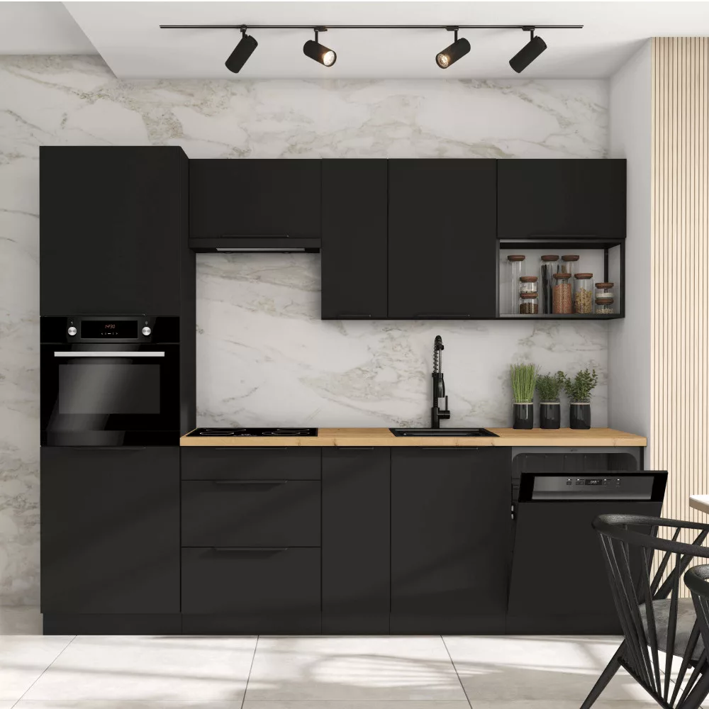 Az alsó szekrényeket az alsó sínnel együtt szállítjuk, asztallap nélkül.