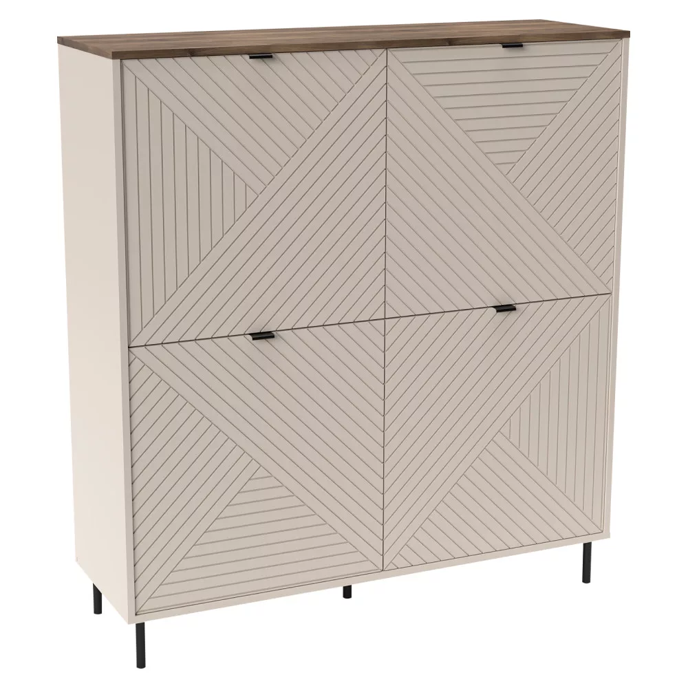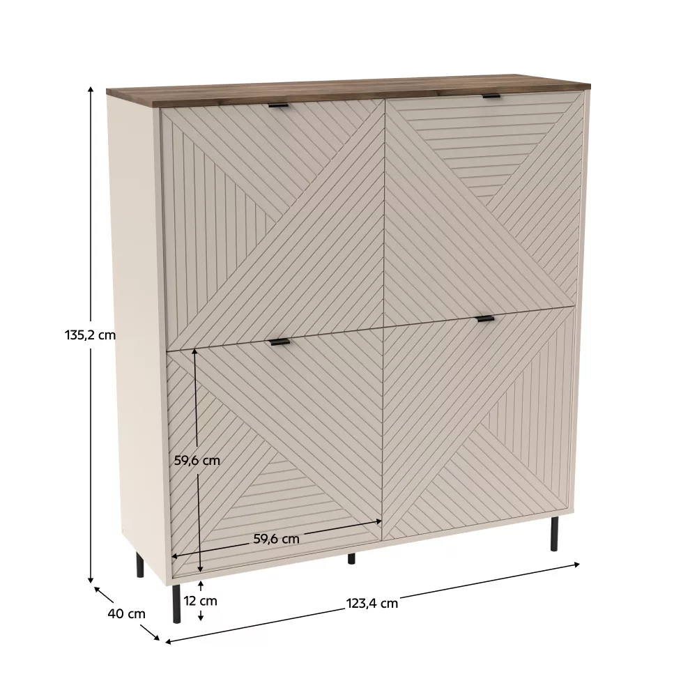 Anyag: laminált DTD/fóliázott MDF/ABS élek Szín: kasmír/castello tölgy Méretek (SzxMéxMa): 123,4x40x135,2 cm Anyag vastagsága: 1,6 cm Négyajtós Négy szekrény Szekrény méretei (SzxMa): 59,6x59,6 cm Polcos Fogantyúkkal Fogantyúk anyaga: fém Fogantyúk színe: fekete Lábakon Lábak anyaga: fém Lábak színe: fekete Lábak magassága: 12 cm Felső lap teherbírása: 10 kg Polc teherbírása: 5 kg Dekoratív ajtók Modern dizájn Ajánljuk a falhoz rögzíteni Szétszerelve szállítva