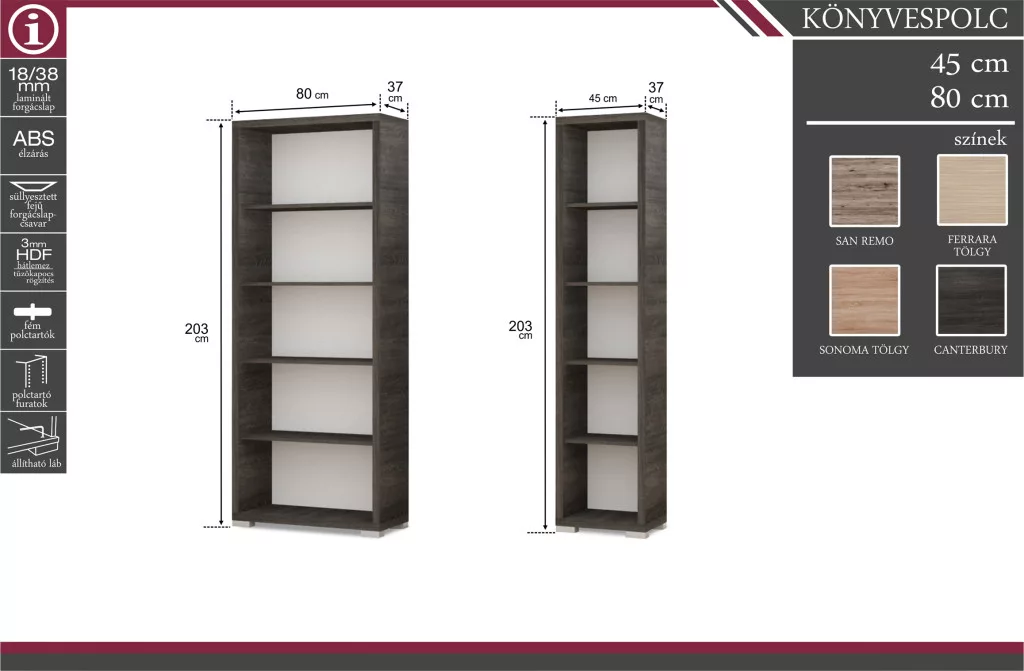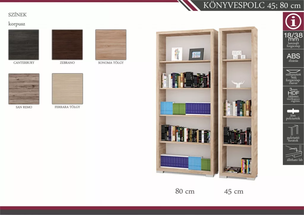 -Korpusz: rusztik fehér, katthult, sonoma tölgy, artisan tölgy, san remo, canyon tölgy, matt sötétszürke és matt fekete, justus tölgy