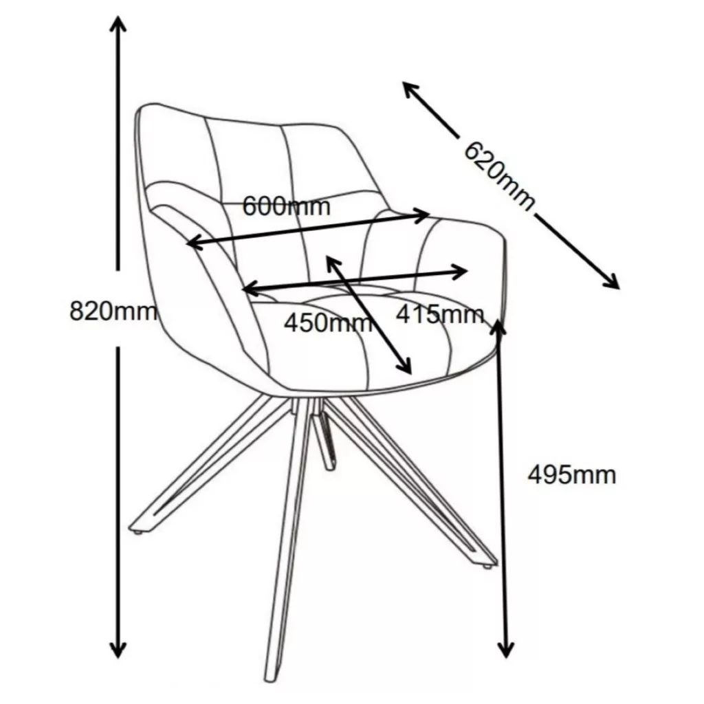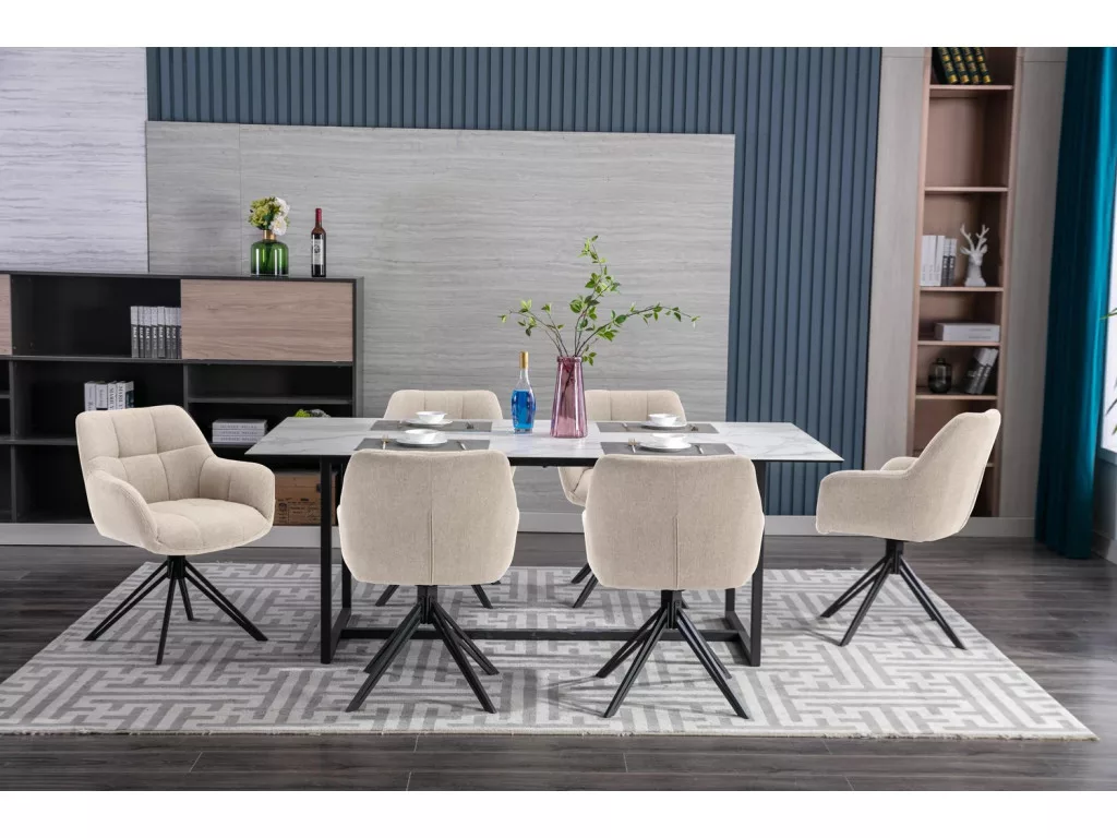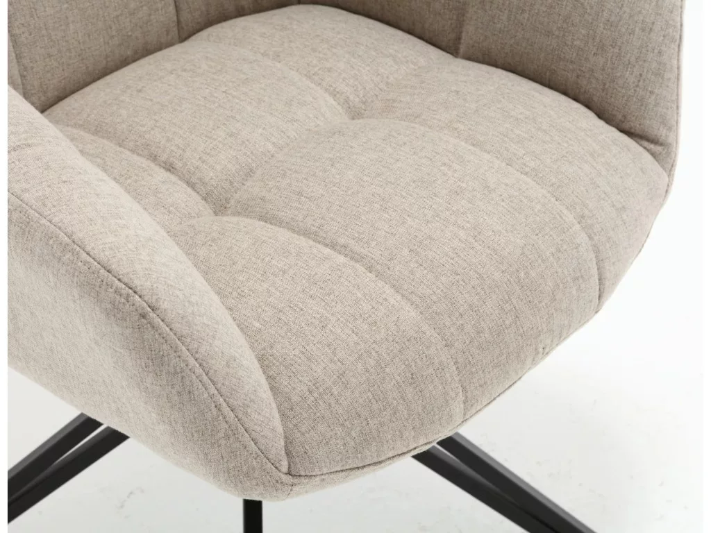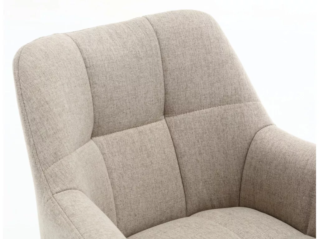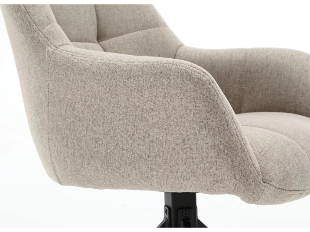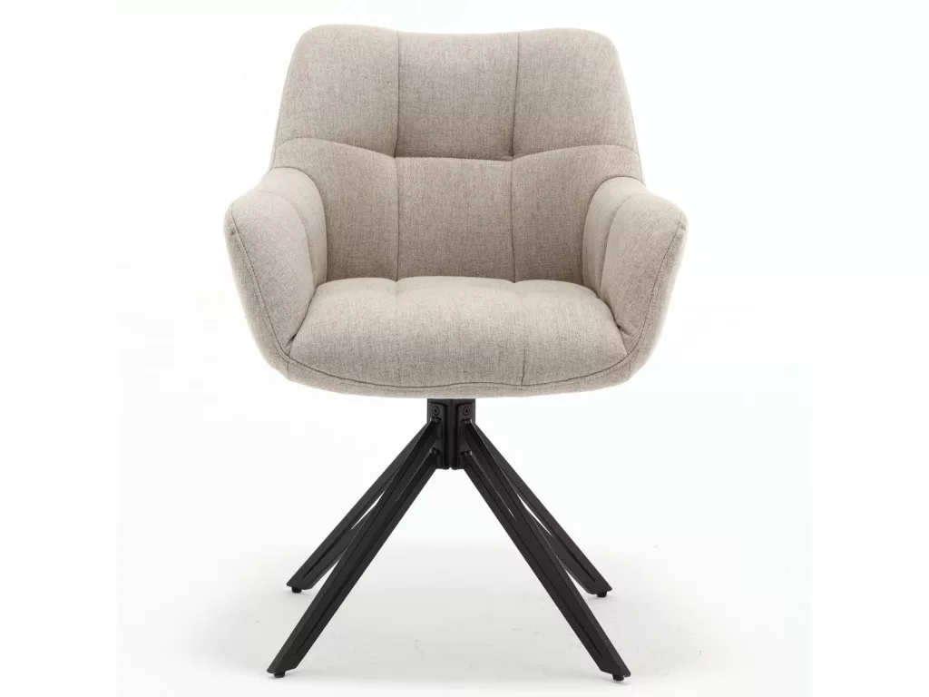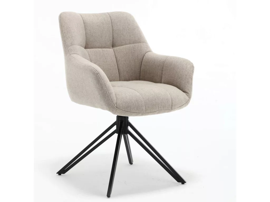 Kényelmes étkezőszék karfákkal, puha bézs vagy szövettel kárpitozva. Az ülőfelület és a háttámla díszes varrással van ellátva, ami fokozza a szék megjelenését. Az alapzatban található forgólap lehetővé teszi az ülőfelület 180°-os elforgatását.A szék négy fémlábon áll, amelyek fekete porfestett bevonattal rendelkeznek a környezeti hatásokkal szembeni jobb védelem érdekében. A szék maximális teherbírása 120 kg.