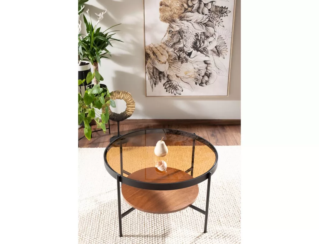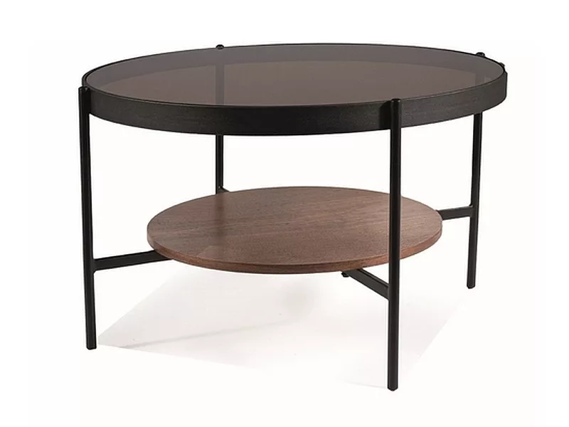 Dohányzóasztal, asztallap: borostyánszínű edzett üveg + MDF + természetes furnér, váz: fém, szín: dió / matt fekete.