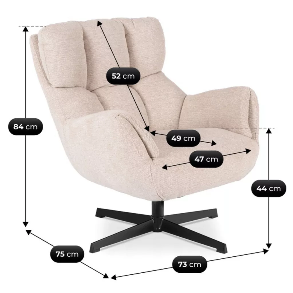 REAL Cream forgófotel. Akár nappalit, hálószobát vagy stílusos üzlethelyiséget rendez be, a Real fotel nagyszerű választás. Modern formája és krémszíne tökéletesen illik a minimalista dizájnokhoz és az elegánsabb belső terekhez. Mitől tűnik ki ez a modell? Stílusos dizájn: A gondosan kidolgozott varrás és a kifinomult részletek egyedi karaktert kölcsönöznek neki, így feltűnő dizájnelem. Magas kényelem: A széles, puha ülés az ergonomikus háttámlával kombinálva teljes ellazulást biztosít – ideális pihenéshez, olvasáshoz vagy beszélgetéshez. Tartós, krémszínű szövet: A kárpit kopásálló anyagból készült. Kellemes tapintású, és sokáig megőrzi esztétikai megjelenését. 360°-os forgófunkció: A forgómechanizmus szabad mozgást tesz lehetővé felállás nélkül, míg a stabil talp növeli a mindennapi használat kényelmét. Erős konstrukció: A masszív váz biztonságos és tartós használatot biztosít. Hol teljesít a legjobban? A nappaliban, ideális helyként a mindennapi kikapcsolódásra, a hálószobában, hangulatos pihenősarkot teremtő elemként, kiszolgáló helyiségekben, például várótermekben, szállodákban vagy szépségszalonokban. Kinek ideális? Azoknak, akik kényelmes és ízléses fotelt keresnek, a modern formák kedvelőinek, kereskedelmi ingatlanok tulajdonosainak. Real - egy fotel, amely elősegíti a pihenést.