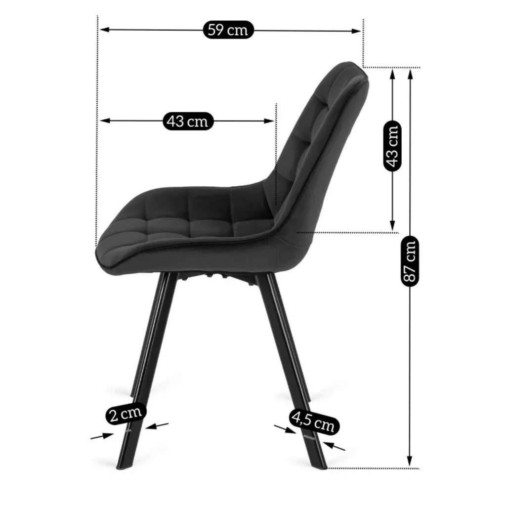RICK kárpitozott szék fekete színben: A stílus új dimenziója az étkezőjében. Étkezője felfrissítéséről álmodik? Nyitott nappali berendezését tervezi, és inspirációra vágyik? Fontosnak tartja a kiváló minőséget vonzó áron? A fekete Rick kárpitozott szék megfelel az elvárásainak! A puha bársony, az élénk színek és az eredeti dizájn új dimenziót visz otthonába. Ismerje meg jobban! Puha bársony és masszív konstrukció. A bársony kárpit kopásálló és bolyhosodó. A finom steppelések eleganciát kölcsönöznek és megerősítik az anyag szerkezetét. Puha hab a háttámlában és az ülőfelületben. Fekete porszórt acél lábak. Stabil konstrukció. Könnyen tisztítható. Egészítse ki otthonát stílusosan! A fekete egy feltűnő, mégis sokoldalú szín. Ez lehetővé teszi, hogy a Rick széket számos belső stílushoz igazítsa. Tökéletesen mutat egy tetőtéri nappali közepén, vagy egy modern étkező kiegészítőjeként. Jól mutat nyilvános helyeken is, például kávézókban, várótermekben és szépségszalonokban. A Rick magasabb esztétikai szintre emeli otthonát.