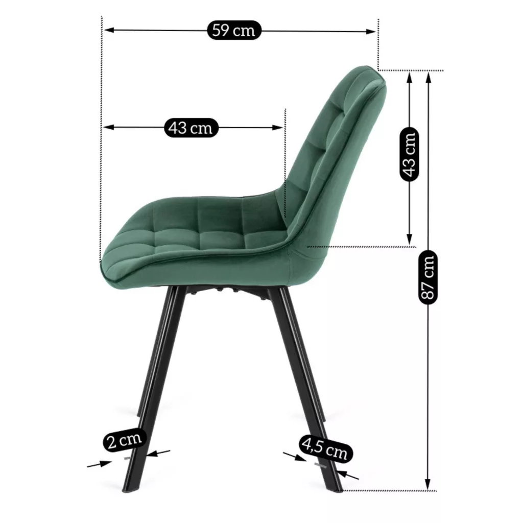 Rick kárpitozott szék sötétzöld színben: Kényelem és stílus modern dizájnban. A sötétzöld Rick szék ötvözi a kényelmet, a minőséget és a dizájner megjelenést. Egyedi sziluettje vonzza a figyelmet és stílust kölcsönöz bármely helyiségnek, miközben maximális kényelmet biztosít. Tökéletes választás azok számára, akik értékelik a kényelmet, a minőséget és a stílusos megjelenést. A Rick szék előnyei: Bársony kárpitozás, amely ellenáll a bolyhosodásnak és a kopásnak. A steppelt szövet fokozza az esztétikai vonzerőt. A háttámla és az ülőlap puha habszivacs réteggel van kitöltve. A fekete porszórt acél lábak stabilitást biztosítanak. Könnyen tisztítható. Egyedi forma, amelyet az Ön igényeire szabtak. A Rick szék nemcsak modern vonalaival, hanem átgondolt kialakításával is kiemelkedik, amely elősegíti a pihenést és a mindennapi használatot. Sziluettje finoman ötvözi az esztétikát az ergonómiával, biztosítva a kényelmet a stílus feláldozása nélkül. Tökéletes választás azok számára, akik olyan bútordarabot keresnek, amely egyszerre gazdagítja a belső teret és funkcionális berendezési tárgyként is szolgál.