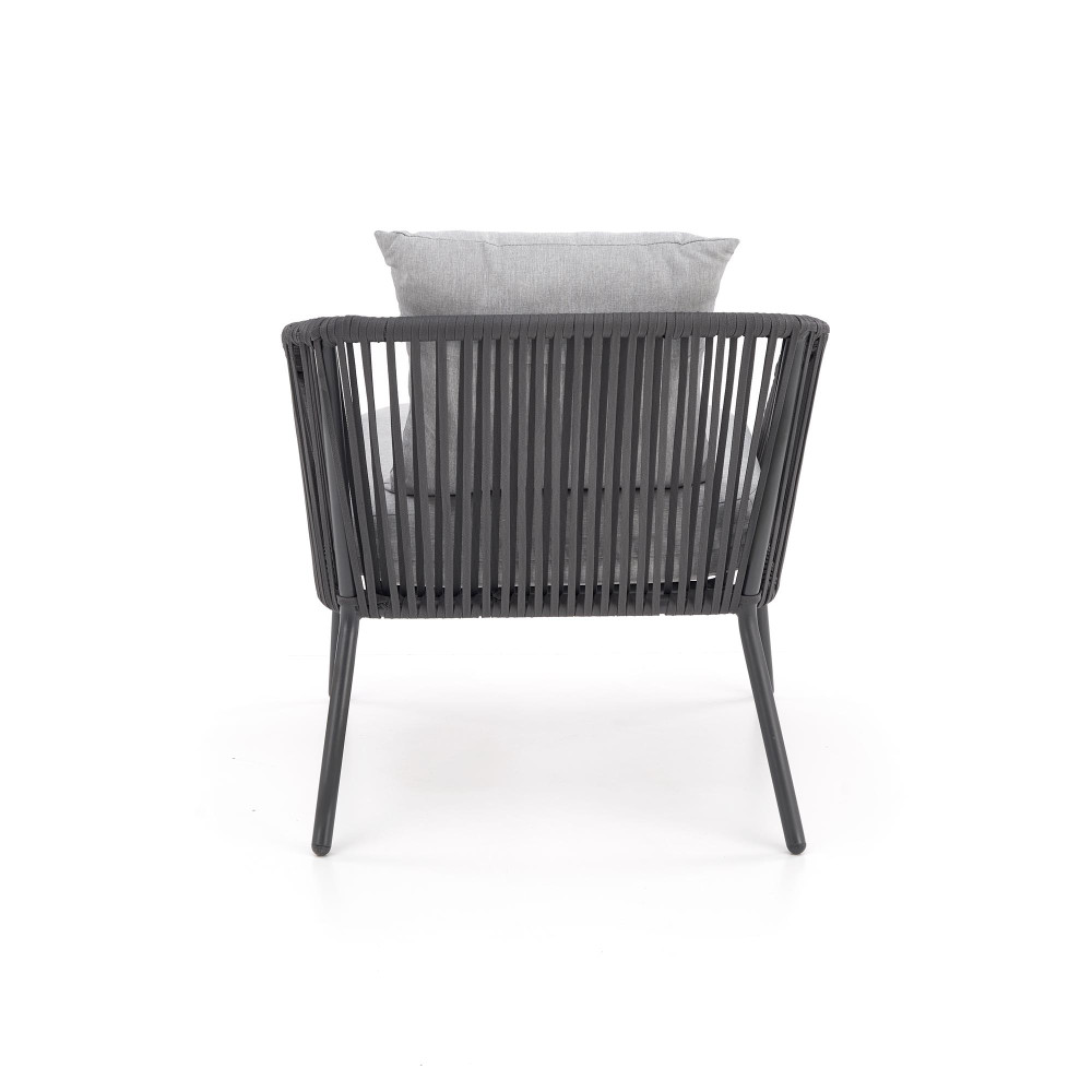 kerti garnitúra ( kanapé + szék 2x + c. asztal ), anyaga: porszórt alumínium / üveg / kötél / kendő, szín: sötétszürke / világosszürke