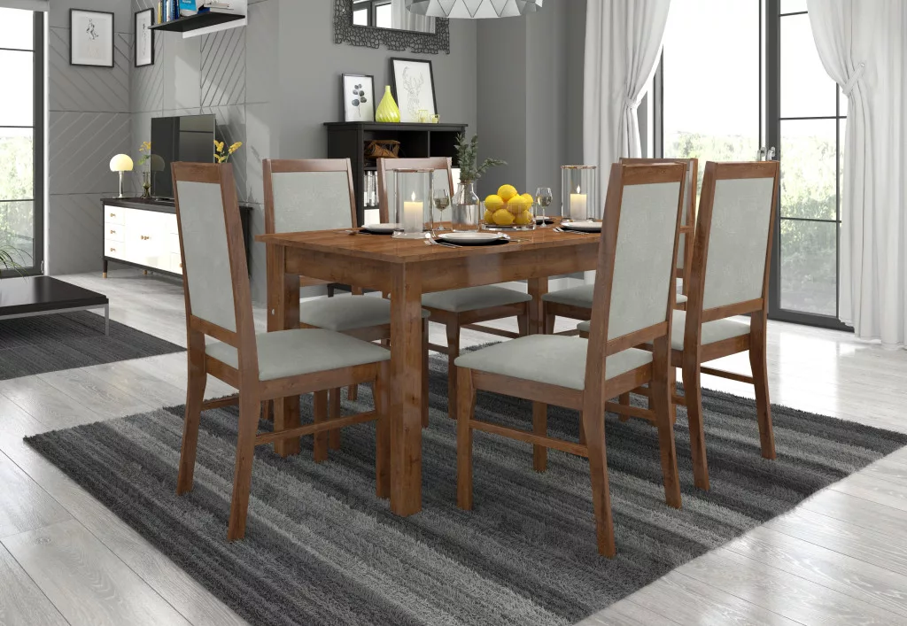A Rhodes 25 szett ideális megoldás egy klasszikus étkezőhöz. A szett tartalmaz egy masszív asztalt és hat kényelmes széket. Az egyszerű formájú asztal kényelmesen befogadhat hat embert. A bútorok nagyon elegánsak és kényelmesek. Válassza ki álmai szettjének színét és textil kollekcióját.