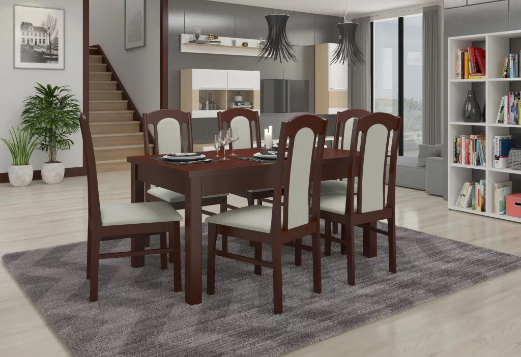 The Rhodes 53 készlet ideális megoldás egy klasszikus ebédlőhöz. A szett tartalmaz egy masszív asztalt és hat kényelmes széket. Az egyszerű formájú asztal kényelmesen befogadhat hat embert. A bútorok nagyon elegánsak és kényelmesek. Válassza ki álmai szettjének színét és textil kollekcióját.