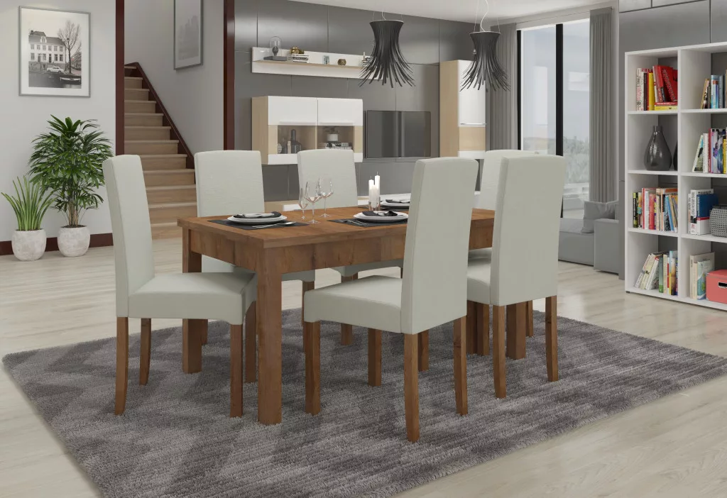 A Rhodes 56 szett tökéletes választás lesz az Ön ebédlőjébe. A szett magában foglal egy téglalap alakú asztalt és hat kárpitozott széket. Az asztalt kiegészítő segítségével kinyithatja, ami 180 cm-re kiterjeszti a tetejét. A stílusos székek stabil bükkfa lábakkal rendelkeznek, és bármely galériában látható szövetből választható ülő- és háttámlával vannak ellátva. A széles színválaszték révén ez a szett bármely belső térbe illeszkedik, és tökéletes kiegészítője lehet nappalijának, konyhájának vagy ebédlőjének...