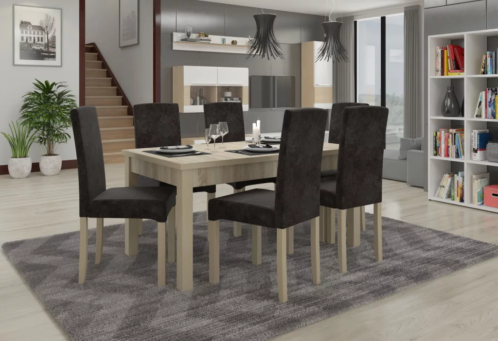 A Rhodes 56 szett tökéletes választás lesz az Ön ebédlőjébe. A szett magában foglal egy téglalap alakú asztalt és hat kárpitozott széket. Az asztalt kiegészítő segítségével kinyithatja, ami 180 cm-re kiterjeszti a tetejét. A stílusos székek stabil bükkfa lábakkal rendelkeznek, és bármely galériában látható szövetből választható ülő- és háttámlával vannak ellátva. A széles színválaszték révén ez a szett bármely belső térbe illeszkedik, és tökéletes kiegészítője lehet nappalijának, konyhájának vagy ebédlőjének...