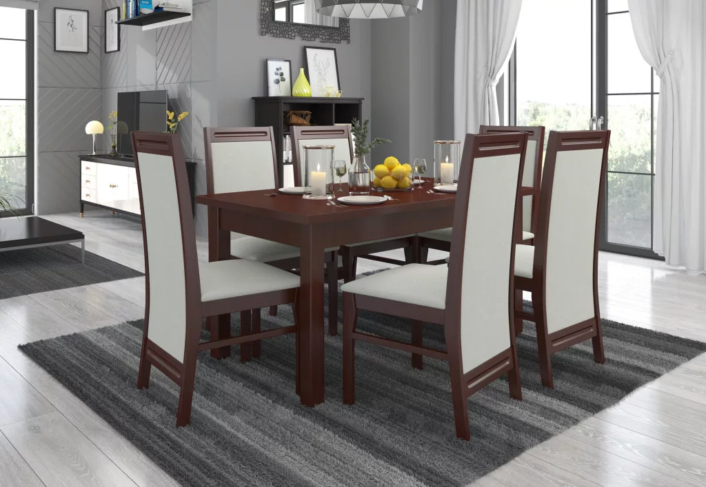 A Rhodes 7 készlet ideális megoldást nyújt egy klasszikus étkezőszobához. A készlet tartalmaz egy masszív asztalt és hat kényelmes széket. Az egyszerű formájú asztal kényelmesen befogadhat hat embert. A bútor nagyon elegáns és kényelmes. Válassza ki színét és szövetkollekcióját, hogy álmai készletét tervezhesse meg.