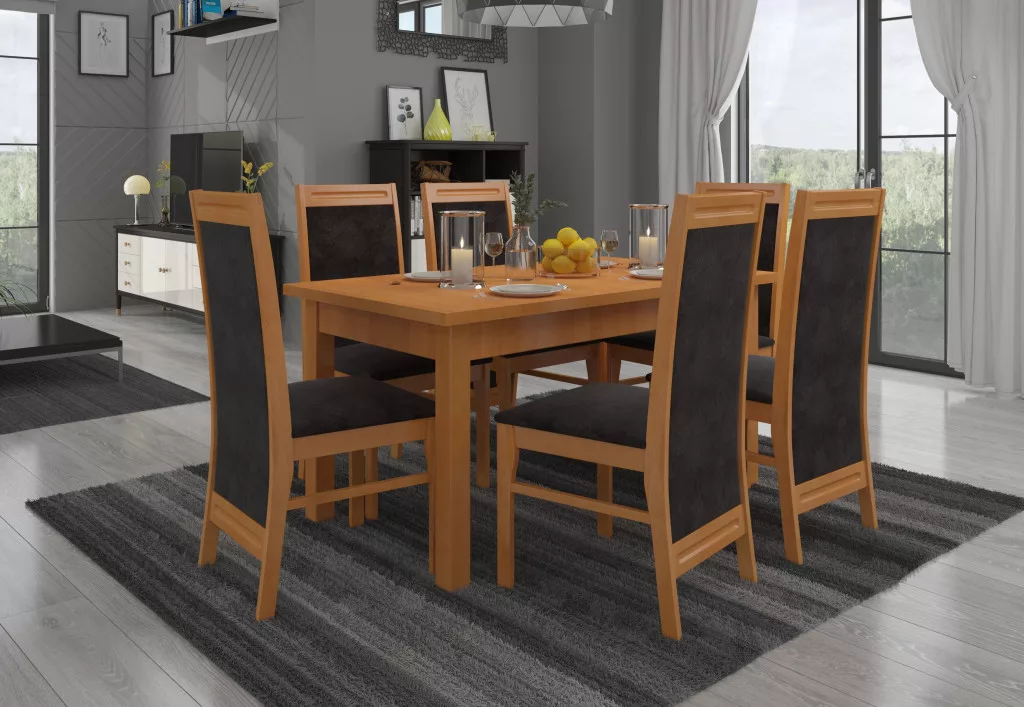 A Rhodes 7 készlet ideális megoldást nyújt egy klasszikus étkezőszobához. A készlet tartalmaz egy masszív asztalt és hat kényelmes széket. Az egyszerű formájú asztal kényelmesen befogadhat hat embert. A bútor nagyon elegáns és kényelmes. Válassza ki színét és szövetkollekcióját, hogy álmai készletét tervezhesse meg.