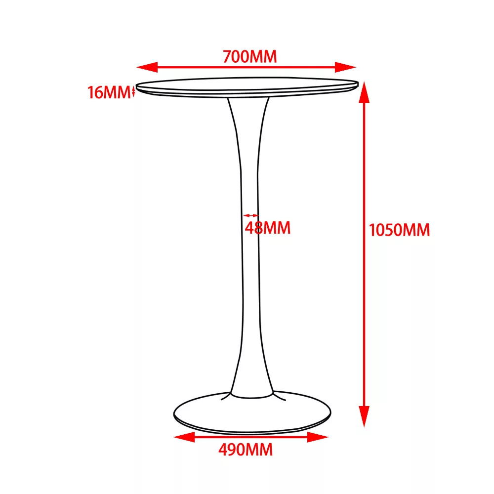 Praktikus bárasztal, teljesen fekete színben kapható. Az asztallap kerek alakú, matt feketére festett MDF anyagból készült. Az asztallap átmérője 70 cm, vastagsága 1,6 cm. Az egyoszlopos láb fémből készült, alján 49 cm széles talppal rendelkezik, ami nagy stabilitást biztosít. Az alap porfestett, ugyanolyan fekete színnel, amely illeszkedik az asztallap színéhez. Az asztal maximális teherbírása 20 kg.