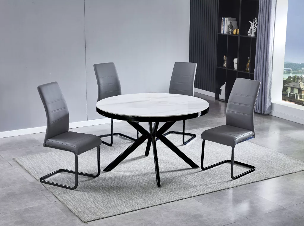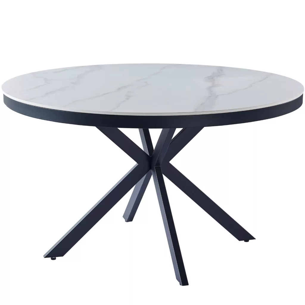 Kerek étkezőasztal, 120 cm átmérőjű fehér asztallappal. Az asztallap 12 mm vastag Snow matt fehér szinterezett kőből készült, és 50 mm vastag fekete fém vázon áll. A szinterezett kő különböző színű természetes kövek kombinációjából készül, és számos előnnyel rendelkezik a hagyományos kerámiákkal szemben. Erősebb, mint a nagy kerámialapok, és nem törik könnyen. A természetes gránitból készült lapokkal összehasonlítva természetesen vízálló is. Környezetbarátabb is, mint a kémiailag kezelt kvarclapok. Az asztal "pók" stílusú lábai 3x8 cm méretű fémcsövekből készültek, és a jobb védelem érdekében fekete porfestett bevonattal vannak ellátva. Az asztal maximális teherbírása 120 kg.