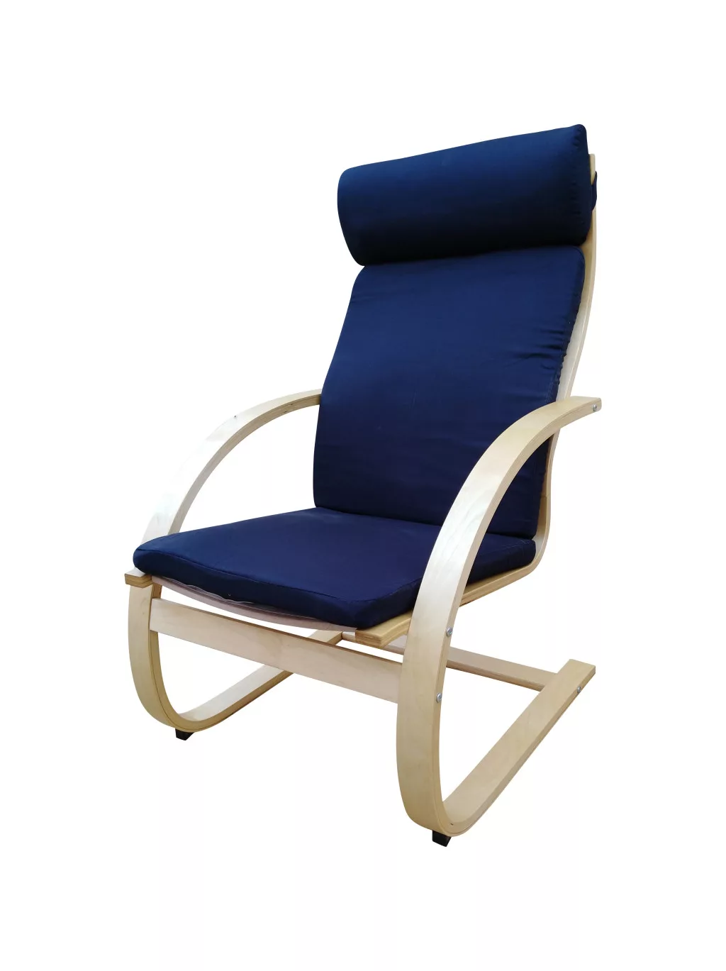 Kényelmes, modern dizájnú relaxfotel lekerekített fejtámlával. Pamuttal kárpitozott. Hajlított nyírfából készült váz. Bézs vagy sötétkék kárpitozással kapható.A relaxfotel maximális teherbírása 120 kg.