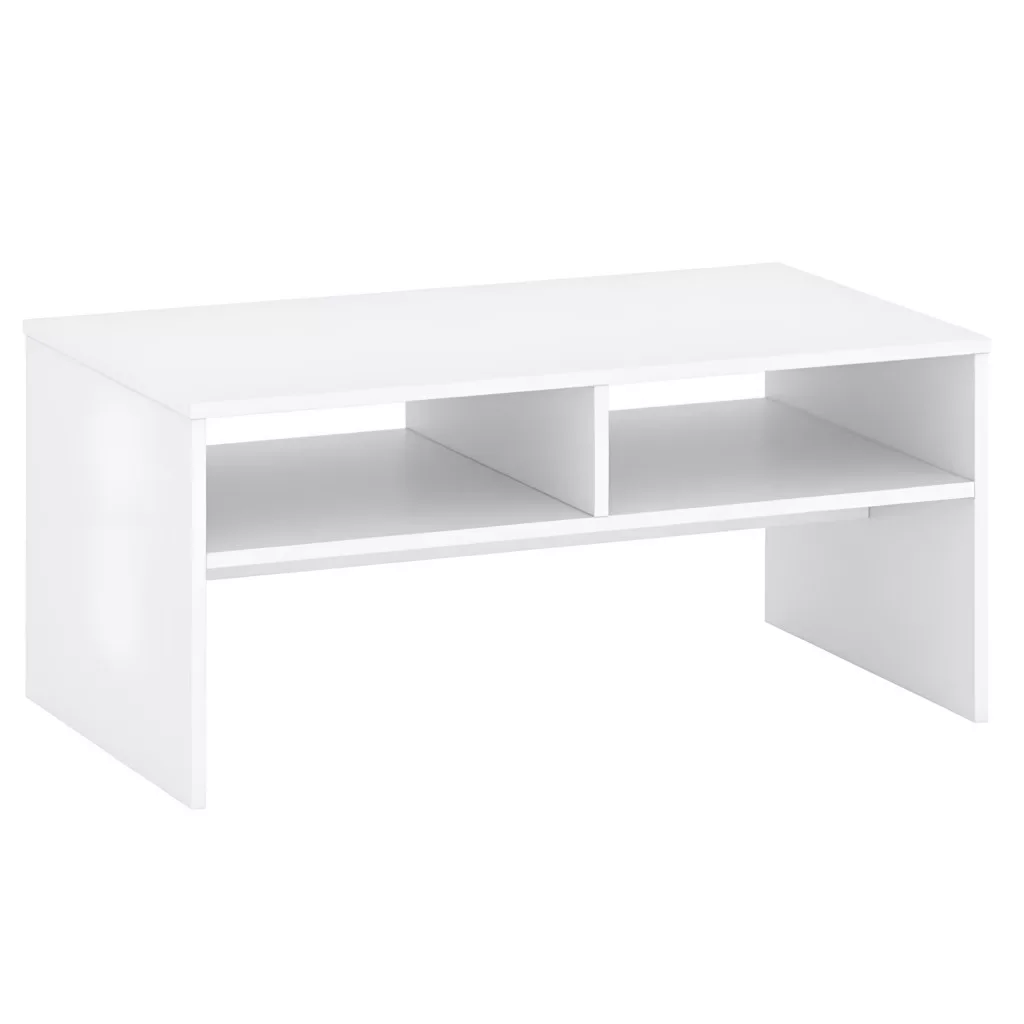 Praktikus dohányzóasztal modern stílusban, teljesen fehér színben. Az egész dohányzóasztal kiváló minőségű, 16 mm vastag forgácslapból készült, melamin borítással. Az asztallap alatt egy polc található kisebb tárgyak tárolására, amelyet egy válaszfal két részre oszt. Az asztallap maximális teherbírása legfeljebb 10 kg, az alsó polc pedig legfeljebb 7 kg.