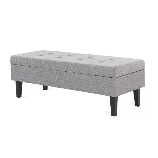 Modern kárpitozott pad tárolórésszel. PU25 habbal kárpitozott és minőségi anyaggal borított, az ülőrész szürke, a lábak fekete színűek. A tárolótér méretei 103,6x36x6x11,8 cm.