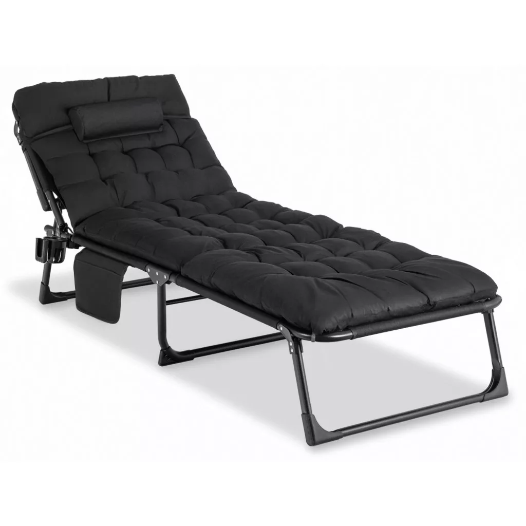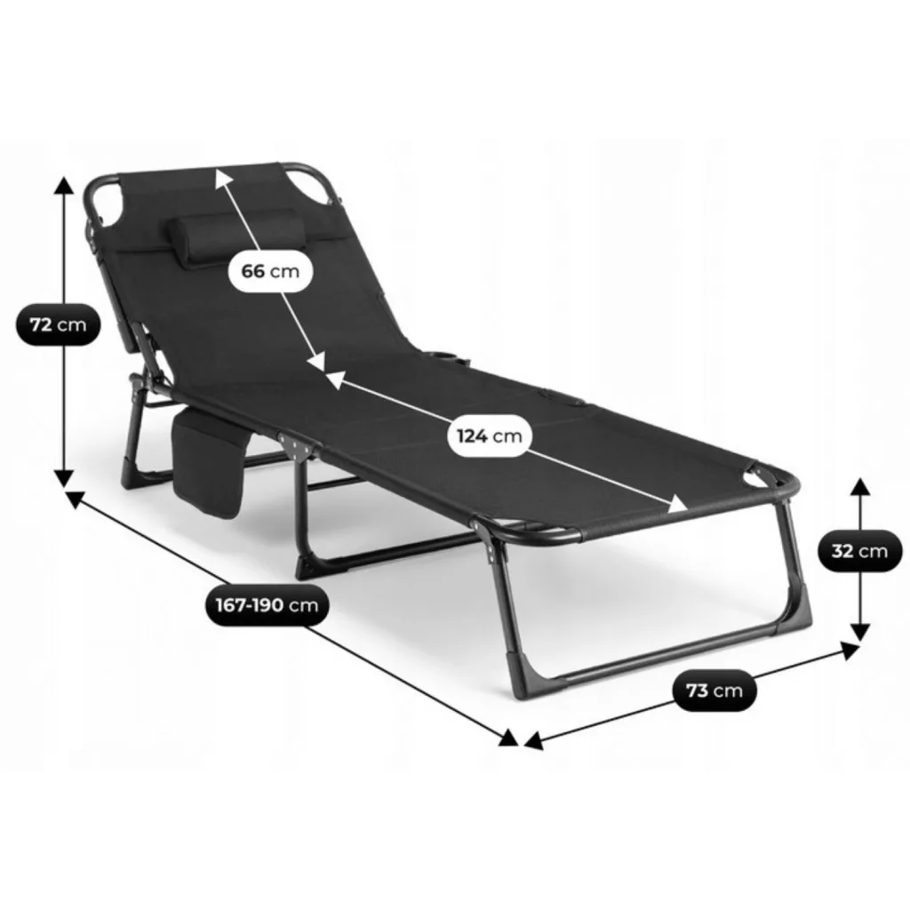 SATURN Összecsukható heverő fekete színben A Saturn összecsukható heverő funkcionális megoldás otthoni és kültéri használatra egyaránt. Tökéletes pótágyként, kényelmes nyugágyként a kertben való pihenéshez, és praktikus utazási lehetőség. Termék előnyei: Állítható háttámla: A mechanizmus lehetővé teszi a dőlésszög egyéni igényeihez való beállítását. Praktikus kiegészítők: A szett tartalmaz egy levehető, steppelt huzatot, egy nyaktámaszos fejtámlát és egy zsebet az apró tárgyaknak. Italtartó: Mindig kéznél tart egy poharat vagy palackot. Sokoldalú felhasználás: Tökéletes a nappaliban pótágyként, a kertben a szabadtéri kikapcsolódáshoz és utazáshoz. Kényelmes méretek: Hálószoba: 190 x 73 cm. Könnyű összecsukás: Kompakt kialakításának köszönhetően könnyen szállítható és tárolható. Tartós konstrukció: Az időjárásálló anyagok tökéletessé teszik a Saturnt kempingezéshez, grillezéshez és családi kirándulásokhoz. A Saturn heverővel kényelmesen pihenhet, bárhol is van.
