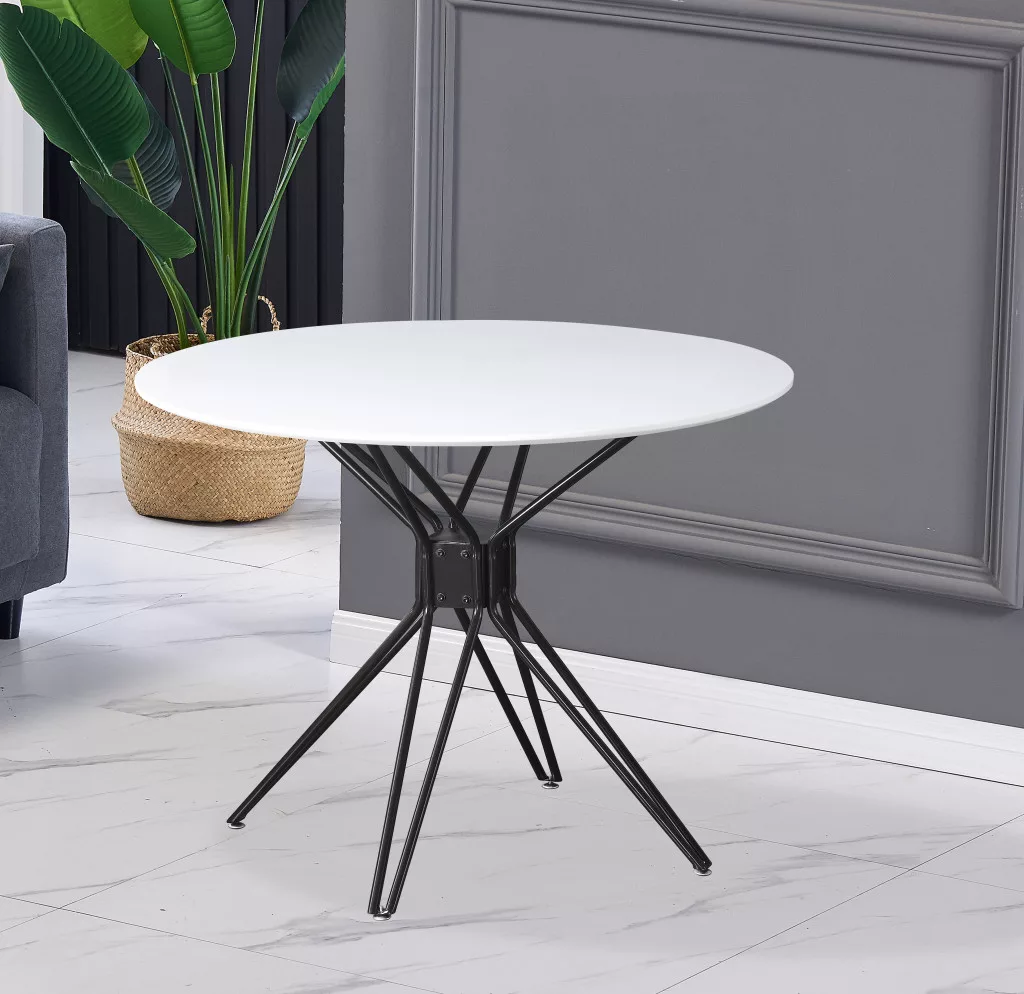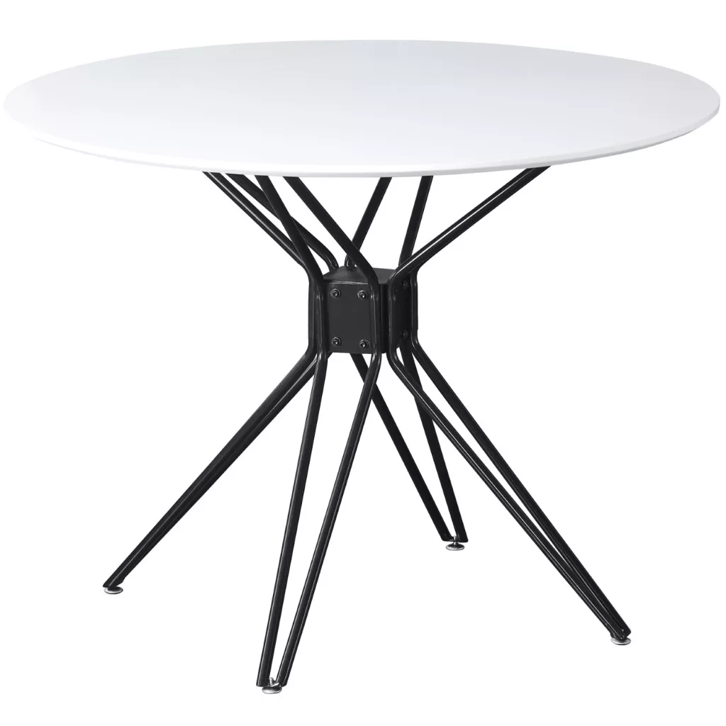 Modern, kerek étkezőasztal. Az asztallap fehér MDF anyagból készült. A lap vastagsága 1,8 cm. A vonzó, tarka formájú alap fémből készült, és fekete színű porszórt bevonattal rendelkezik. Maximális teherbírás 130 kg.