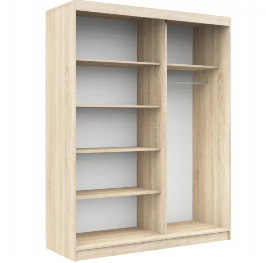 Két tolóajtóval került kialakításra, amely helytakarékos, így kisebb szobákban is praktikus megoldás. A szekrény ajtókat eltolva egy akasztós, illetve egy polcos rész kap helyet.