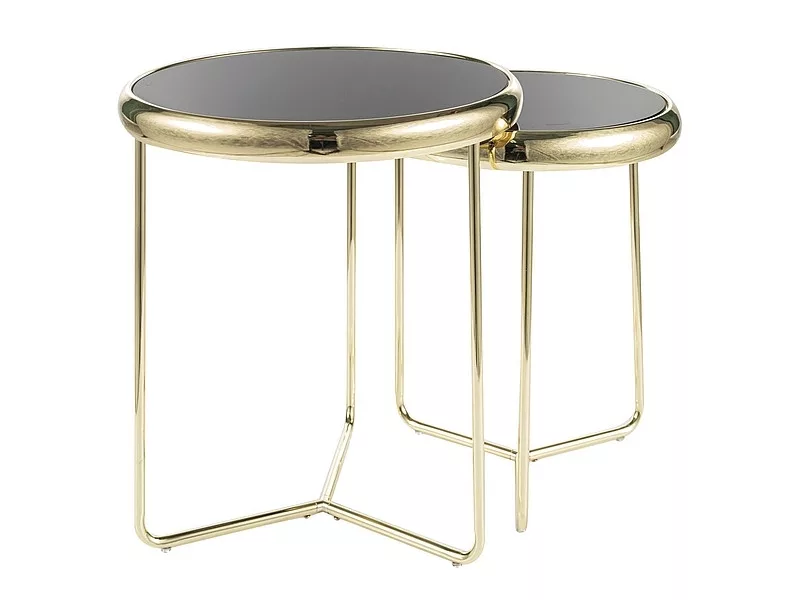 Kávézóasztal szett, asztallap: edzett üveg, keret: fém, szín: fekete / arany. A kisebb asztal méretei: átmérő: 40, magasság: 45 cm.